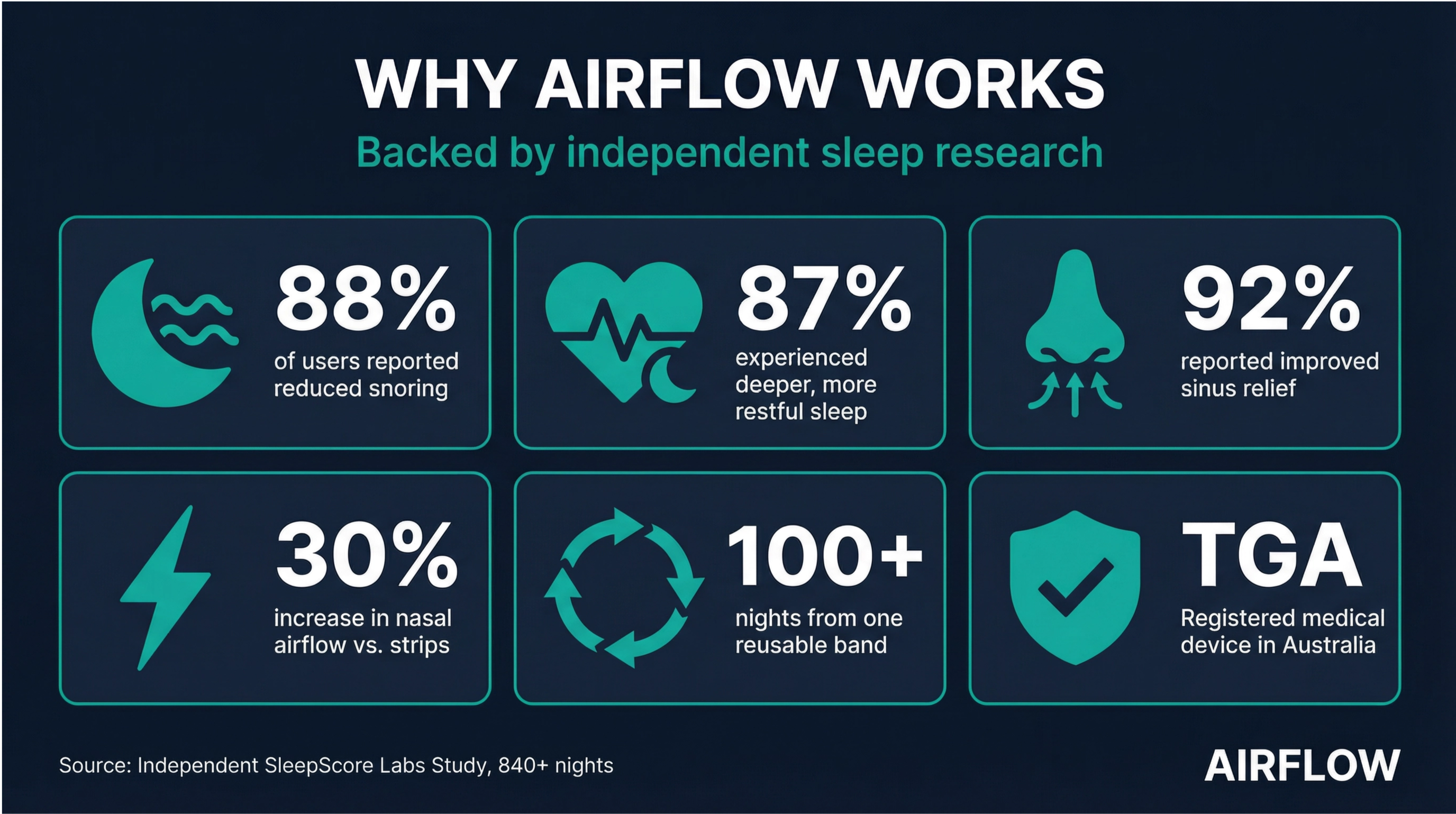 Unlike strips that go in the bin every morning, AIRFLOW's magnetic band lasts for months. Just replace the small adhesive tabs — 30 nights for $25. That's less than $1 a night.